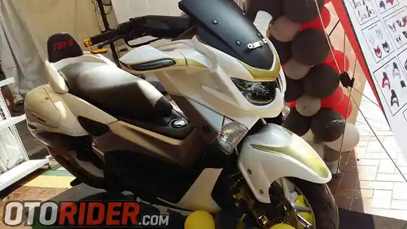 Di sana ada gerai Tons Motor Body Custom yang menyediakan beragam aksesori bodi custom khusus NMax. Diantaranya headlamp cover, side mirror, front fender, side box (full set), backrest hingga exhaust cover.