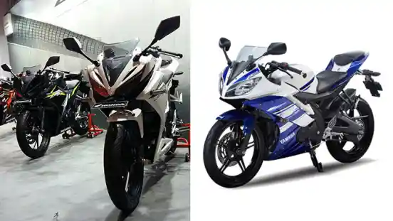 Spesifikasi Yamaha R15 Dimensi Panjang X Lebar X Tinggi: 1.975 x 660 x 1.070 mm Jarak Sumbu Roda: 1345 mm Jarak terendah ke tanah: 160 mm Berat kosong: 136 Kg Kapasitas tangki bahan bakar: 12 Liter Rangka Rangka : Delta Box Speedometer : Semi Digital Suspensi Depan : Telescopic Suspensi Belakang : Link Type Monocross Ukuran Ban Depan : 90/80-17 Tubeless Ukuran Ban Belakang : 130/80-17 Tubeless Rem Depan : Cakram 245mm Rem Belakang : Cakram 220mm Mesin Kapasitas mesin : 149.8cc Tipe Mesin : SOHC Perbandingan Kompresi : 10.4 : 1 Max Power : 17 dk/8500 RPM Max Torque : 15 Nm/7500 RPM Bore x Stroke : 57mm x 58.7 mm Sistem Pengkabutan : Injeksi Transmisi : 6 – Speed Sistem Pendingin : Radiator | Spesifikasi Honda All New CBR150R Dimensi Panjang X Lebar X Tinggi: 1.983 x 694 x 1.039 mm Jarak Sumbu Roda: 1.311 mm Jarak terendah ke tanah: 166 mm Berat kosong: 135 Kg Kapasitas tangki bahan bakar: 12 Liter Rangka rangka: Diamond (Truss) Frame Tipe suspensi depan: Teleskopik Tipe suspensi belakang: Suspensi Tunggal dengan Sistem Suspensi Pro-Link Ukuran Ban Depan: 100/80 - 17 M/C [Tubeless] Ukuran Ban Belakang: 130/70 - 17 M/C [Tubeless] Rem Depan: Cakram Hidrolik dengan Piston Ganda Rem Belakang: Cakram Hidrolik dengan Piston Tunggal Mesin Mesin: 4-Langkah, DOHC, 4-Katup Silinder Tunggal Volume Langkah: 149.16 Cc Diameter X Langkah: 57,3 x 57,8 mm Perbandingan Kompresi: 11,3 : 1 Daya Maksimum: 17,1 dk / 10.500 rpm Torsi Maksimum:13,7Nm / 7.500 rpm Pendinginan: Radiator |