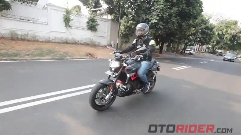 Mengusung gaya naked, Shiver 900 menawarkan posisi berkendara cukup tegak. Meski tidak tegak-tegak amat, karena posisi riding agak menunduk ke depan. Buat yang gemar sporty riding, pas banget, nih posisinya. Setang telanjangnya juga tidak terlalu lebar, sehingga cukup moderat ketika diajak meliuk di kemacetan Jakarta, khususnya jalan raya Pondok Indah yang selalu ramai.