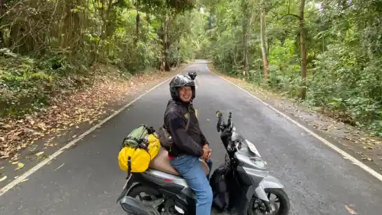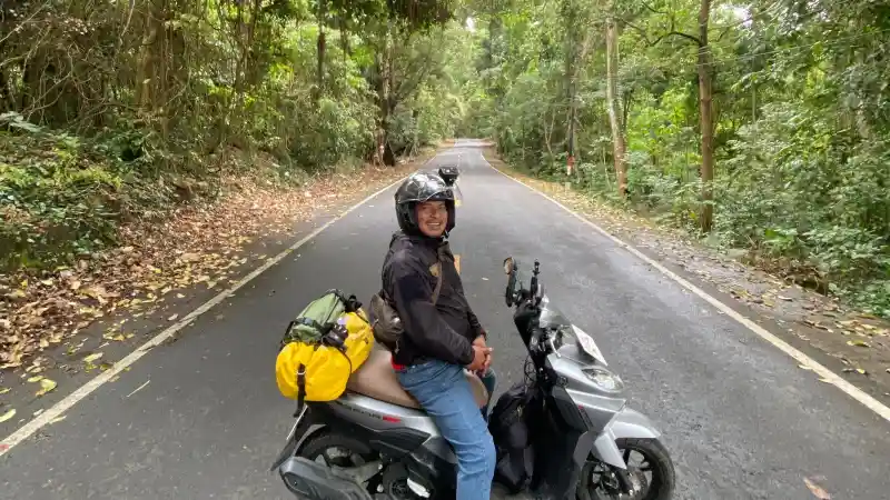 Dirinya menempuh rute ekstrem dari Yogyakarta menuju Mandalika, Lombok, dan kembali lagi ke kota asalnya dengan menggunakan Yamaha Gear Ultima.