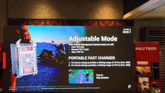 Polytron meluncurkan Adjustable Portable Fast Charging 25A untuk motor listrik FOX Electric. Dukung perjalanan jarak jauh, dilengkapi BMS dan tiga mode pengisian daya.