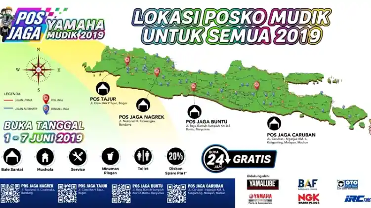 Selama libur Lebaran, tak menampik banyak pengguna sepeda motor yang menggunakan kendaraannya untuk bepergian. Tak hanya jarak dekat, bahkan jarak jauh sekalipun. Maka, menyambut hari Raya Idul Fitri, Yamaha Indonesia bergerak dengan memberikan pelayanan untuk para pemudik seperti 4 pos jaga dan 46 bengkel jaga selama 7 hari mulai dari 1 – 7 Juni 2019 di empat titik lokasi yaitu Tajur (Bogor), Nagrek (Bandung), Buntu (Banyumas) dan Caruban (Madiun).