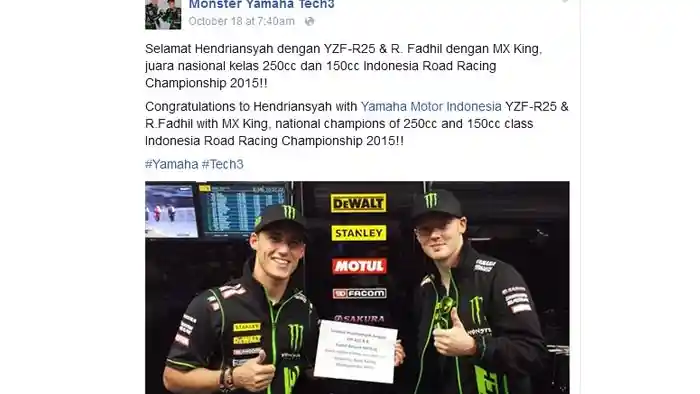 Yup, melalui akun resmi Facebook tim Monster Yamaha Tech3, duet pembalap Pol Espargaro dan Bradley Smith mengucapkan selamat pada dua juara nasional Indonesia. Yakni Hendriansyah di kelas 250 cc dan Rusman Fadhil di 150 cc.