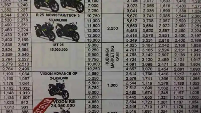 Meski dalam brosur tersebut tidak ada foto Yamaha MT-25 namun jelas model sport naked ini dilbanderol Rp 45 juta alias lebih murah Rp 8 juta dari model fairing R25. Dan bukan sekedar harga terpampang, dalam brosur yang sama juga diterangkan estimasi cicilan dengan berbagai macam pilihan downpayment. Bahkan interval kreditnya pun dibuatkan.