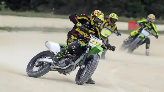 VR46 pun memberi penjelasan sedikit mengenai trek ini. Bukan trek aspal tapi buka juga trek motocross. MotoRanch lebih mirip flat track. Melahapnya, bisa dengan motor trail atau enduro tapi dengan kembang ban tak terlalu kasar. Tujuannya, supaya bisa merasakan gejala sliding pada motor. Tak heran, berbagai aksi Rossi dan teman-temannya selalu sliding di sini.