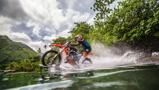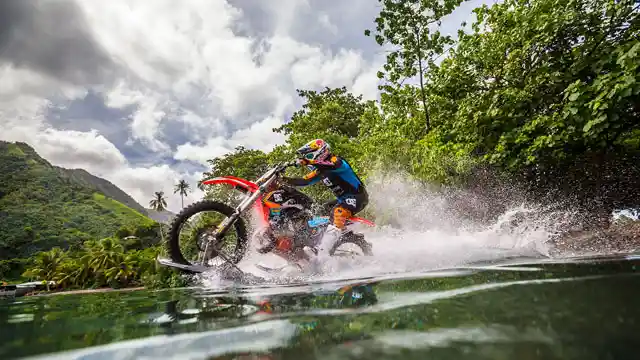 Tak cukup beraksi lompat freestyle motocross, Robbie Maddison membawa motor trailnya mencoba surfing di Tahiti. Surfing? Naik motor di atas air saja tidak masuk di akal, bukan? Namun kerja keras Robbie selama 2,5 tahun berbuah manis. Dengan memberikan semacam papan di bawah ban depan dan belakang, ia bisa ngebut di atas air layaknya jetski dan bahkan menaklukkan ombak besar di Tahiti.