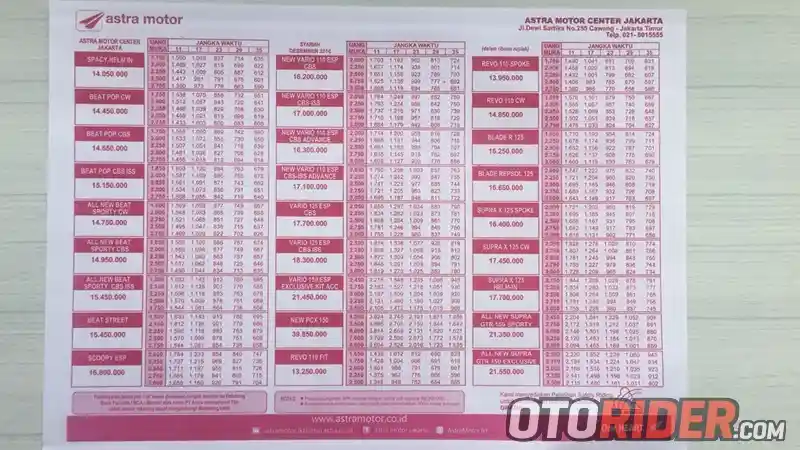 Tipe motor matik Honda Spacy Helm in Rp 14 juta, Beat Pop CW Rp 14,45 juta, Beat Pop CBS Rp 14,65 juta, Beat Pop CBS ISS Rp 15,15 juta, All New Beat Sporty CW Rp 14,75 juta, All New Beat Sporty CBS Rp 15,45 juta, All New Beat Sport CBS ISS Rp 15,45 juta, Beat Street Rp 15,45 juta, Scoopy ESP Rp 16,8 juta, New Vario 110 ESP CBS Rp 16,2 juta, New Vario 110 ESP CBS ISS Rp 17 juta, New Vario 110 ESP CBS Advance Rp 16,3 juta, New Vario 110 ESP CBS ISS Advance Rp 17,1 juta, Vario 125 ESP CBS Rp 17,7 juta, Vario 125 ESP CBS ISS Rp 18,3 juta, Vario 150 ESP Exklusive Kit ACC Rp 21,45 juta, New PCX 150 Rp 39,85 juta,.
