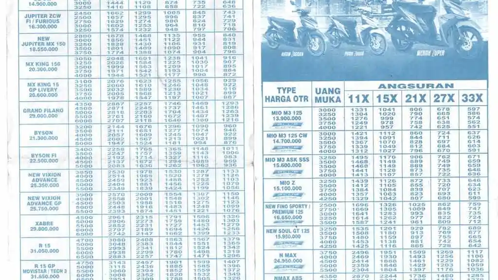 Tipe motor bebek Vega Force DB Rp 14 juta, Vega Force DB CW Rp 14,9 juta, Jupiter Z CW Fi Rp 16,3 juta, New Jupiter MX 150 Rp 18,5 juta, MX King Rp 20,3 juta, MX King GP Livery Rp 20,6 juta, Grand Filano Rp 29 juta, Byson Rp 21,3 juta, Byson Fi Rp 22,5 juta, New Vixion Advance Rp Rp 25,3 juta, New Vixion Advance GP Rp 25,7 juta, Xabre Rp 29,8 juta, R15 Rp 31 juta, R15 GP Rp 31,6 juta, R25 Rp 55,6 juta, R25 ABS Rp 61,6 juta dan MT 25 Rp 46,6 juta