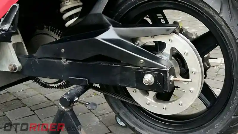 Yup, berbeda dengan skuter matik bermesin bensin, yang berpenggerak sistem CVT dengan cover besar yang juga berfungsi sebagai dudukan sokbreker belakang, maka di Gesits, tampilannya justru lebih simpel dengan belt CVT terbuka plus lengan ayun dan monosok di bagian tengah. Jadi mirip motor berpenggerak rantai.