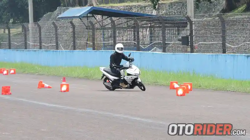 Namun semuanya terasa berbeda saat masuk ke area gymkhana. Respon mesin yang cepat saat buka-tutup gas, motor meliuk tanpa kesulitan. Ditambah bobot ringan makin membuatnya mudah bermanuver.
