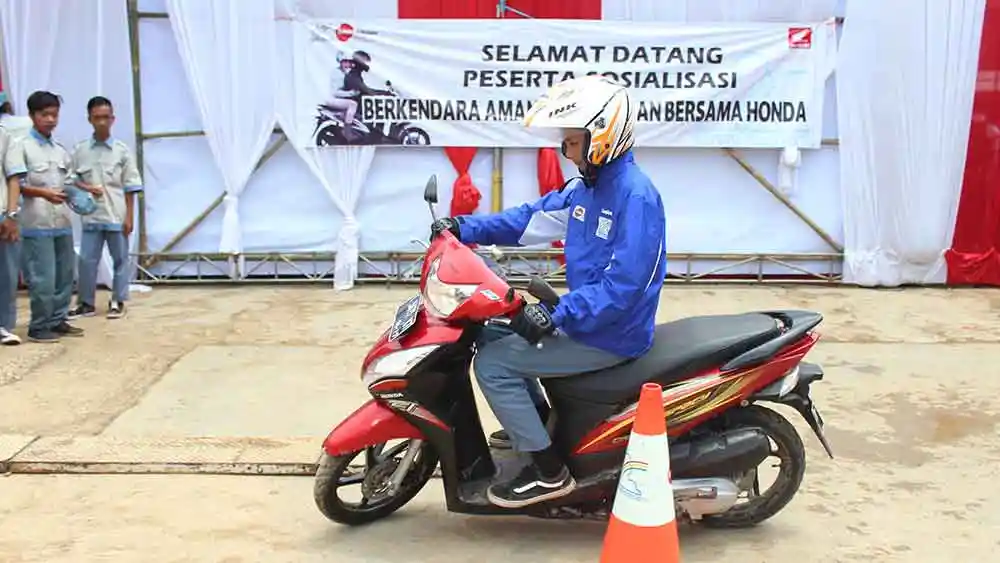 “Materi yang diberikan pada pelatihan safety riding mengenai kesadaran pentingnya keselamatan berkendara dan pengendalian sepeda motor Honda dimulai dari persiapan dan postur berkendara serta teknik berbelok dan keseimbangan,” ujar Asep Wawan Hernawan, Instruktur Safety Riding DAM.