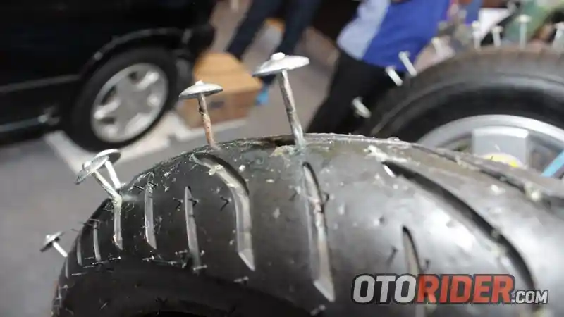 Jangan bingung kalau ketemu dengan ban motor yang tertancap banyak paku pada salah satu stand di GIIAS 2016. Bukan korban ranjau paku, tapi inilah trik PT Tetsan Maju Bersama yang berada di hall 2 D37-D38. TMB yang memproduksi cairan untuk ban IML ikut menyemarakkan acara GIIAS yang berlangsung mulai dari tanggal 11 hingga 21 Agustus 2016. Nah ban yang penuh paku tadi tidak kempes, lho. Karena sudah diberikan Super Tyre Sealant.