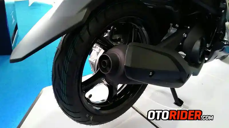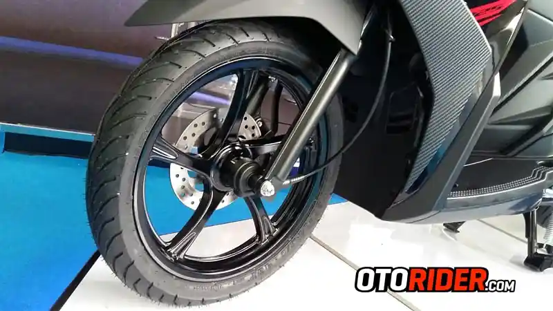 Aplikasi ban lebar membawa konsekuensi dengan penggunaan pelek yang juga lebih lebar. Sayangnya, desain palangnya masih identik dengan kepunyaan Mio Series generasi sebelumnya.