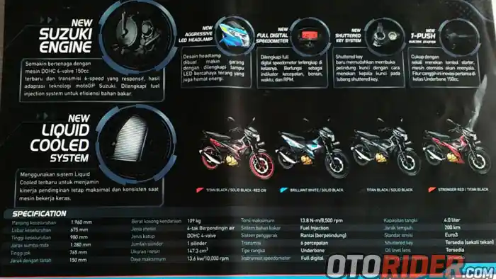 Jika sebelumnya kami mengabarkan soal tenaga mesinnya, kali ini lewat brosur resmi, terkuak fitur-fitur unggulan selain mesin yang tertanam pada Suzuki All New Satria F150. Apa saja? Yuk, tengok.