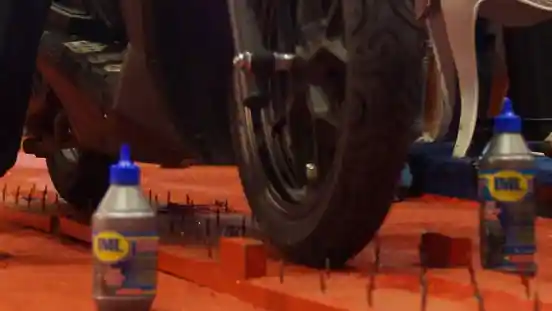 Caranya dengan mengendarai sepeda motor yang sudah dipalikasikan cairan IML Super Tyre Sealant melintas di atas papan yang telah dipasang 10.000 paku.