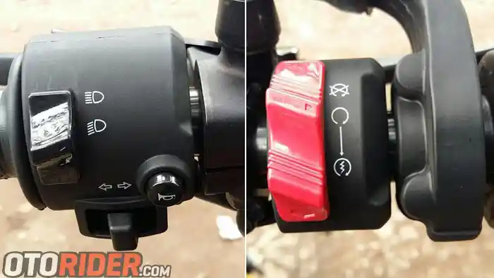 Beralih ke saklar kiri. Di sini hanya tampak tombol engine cut off, tanpa terlihat adanya tombol electric starter. Ternyata, electric starter dibuat terintegrasi dengan tombol engine cut off. Efeknya, tampilan saklar lebih minimalis. Sementara untuk menggunakan electric starter, tombol berwarna merah itu cukup ditekan ke bawah.