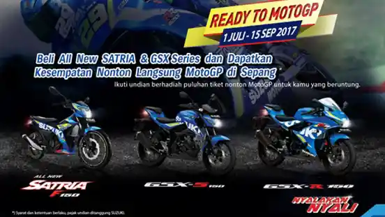 Program menarik yang dibalut dalam konsep undian berhadiah ini ditujukan kepada siapapun yang menjadi pembeli Suzuki All New Satria F150, GSX-R150 dan GSX-S150. Setelah periode program berakhir, SIS akan mengundi dan menentukan konsumen terpilih yang berhak memperoleh kesempatan menonton secara langsung MotoGP seri-17 yang berlangsung di sirkuit Sepang, Malaysia pada 29 Oktober 2017.