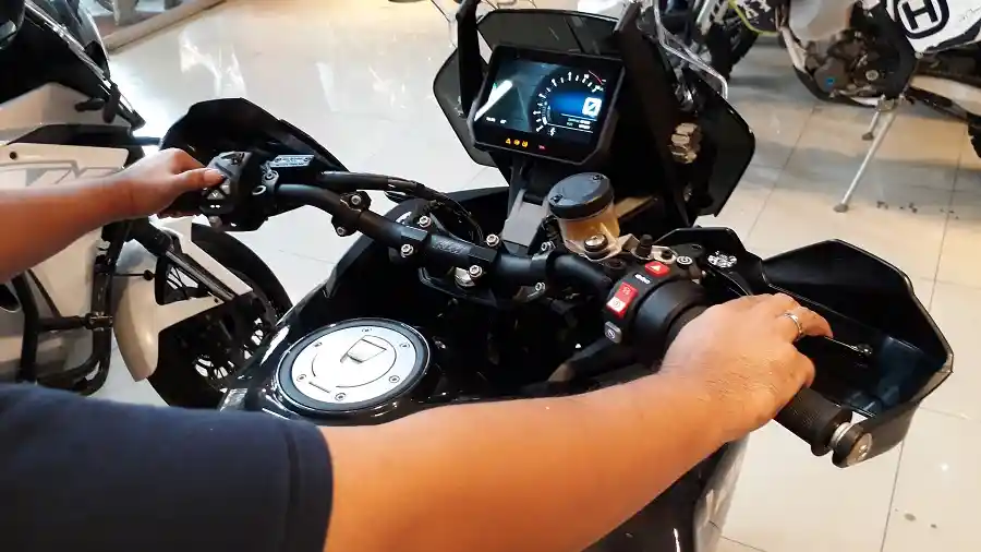 Sejumlah fitur modern melekat pada motor adventure seharga Rp 625 juta (On the Road). Salah satunya keyless entry serta digital display. Tampilan panel indikator seperti tablet di depan setang, sedikit banyak mengingatkan KTM Duke 390 yang juga pakai spidometer berlayar TFT. Fitur ini memudahkan mata rider membaca angka-angka meskipun motor dipacu dalam kecepatan tinggi. Di dalam digital display tersebut terdapat beberapa menu, antara lain jarak tempuh yang bisa dibaca tiap trip, dan konsumsi bahan bakar selama perjalanan. Nah, untuk konsumsi bahan bakarnya sendiri, moge ini diklaim bisa menempuh perjalanan 24 km untuk setiap 1 liter bahan bakar bensin.