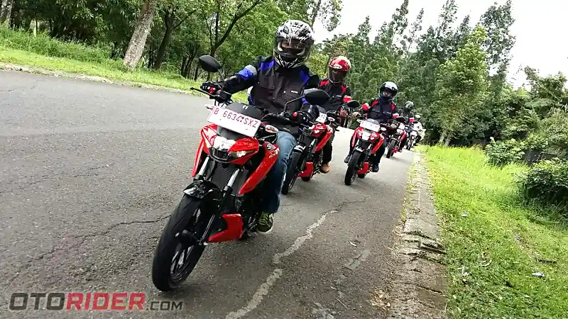 Perjalanan dimulai membelah dalam kota dengan kondisi jalan yang cukup ramai dari Sunter menuju Bukit Pelangi, Sentul melalui By Pass dan Jl. Raya Bogor mudah dilahap. Karena selain lincah, trek yang dominan jalan lurus juga mudah sebagai santapan motor bermesin 150 cc DOHC dengan transmisi 6-speed ini.
