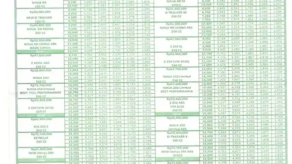 KLX 250 S Rp 62,6 juta, Ninja 250 Limited ABS Rp 69,4 juta, Estrela 250 Rp 70,1 juta, D Tracker 250 Rp 63,4 juta, New Versys 250 Rp 61,9 juta, New Versys ABS Rp 72,7 juta, New Ninja 300 Rp 87,3 juta, Estrela 250 SE Rp 71,6 juta.
