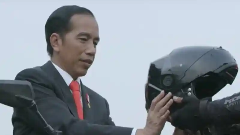 Presiden Republik Indonesia Joko Widodo menggeber Yamaha FZ1 saat acara pembukaan Asian Games 2018, komplet dengan jas, dasi merah dan helm Nolan N104.