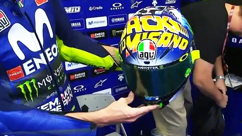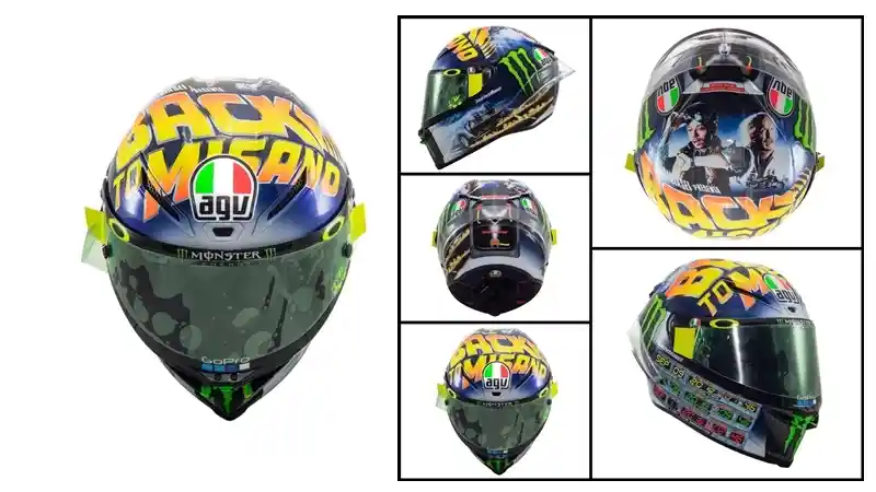 Helm AGV edisi khusus yang digunakan Valentino Rossi terinspirasi dari film ‘Back to the Future’ yang dibintangi aktor Michael J Fox. Helm edisi khusus ini didominasi dengan warna Valentino Rossi yaitu kuning dan biru serta adanya tulisan di bagian depan visor helm ‘Back to Misano’.