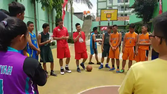 Ketiga pemain basket Satria Muda Pertamina yaitu Audy Bagastyo, Kevin Yonas Sitorus, dan Juan Laurentyang memberikan motivasi di depan siswa SMK Teladan, Jagakarsa, Jakarta Selatan (9/1). Acara itu tidak hanya berdiskusi, melainkan bercerita tentang pengalaman menjadi atlet nasional, serta memberikan pelatihan singkat di lapangan sekolah. Dengan tema ‘Coaching & Clinic SMK Binaan Honda’, kegiataan itu merupakan pertama kali yang dilakukan Wahana dalam memberikan pengetahuan di bidang olahraga untuk SMK Binaan.
