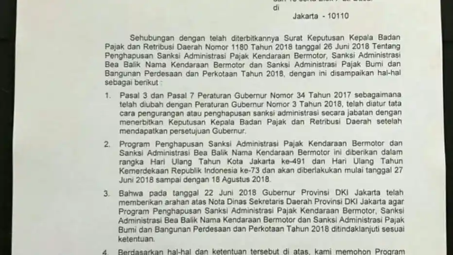 Dilansir dari Pemprov DKI, kebijakan yang diambil dari pemerintah ibukota, terdapat dalam surat keputusan Kepala Badan Pajak dan Restribusi Daerah yang bertanggal 26 Juni 2018 tentang Penghapusan Sanksi Administrasi Pajak Kendaraan Bermotor dan Sanksi Administrasi Bea Balik Nama Kendaraan Bermotor.
