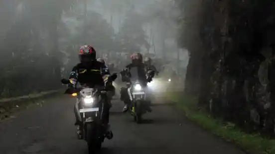 Jalur menantang di perkebunan teh sekitar Pamengpeuk pun menyajikan pengalaman tersendiri. Jalan berliku dengan suhu dingin bikin segar touring. Terlebih rombongan sempat diguyur hujan selepas Pangandaran.
