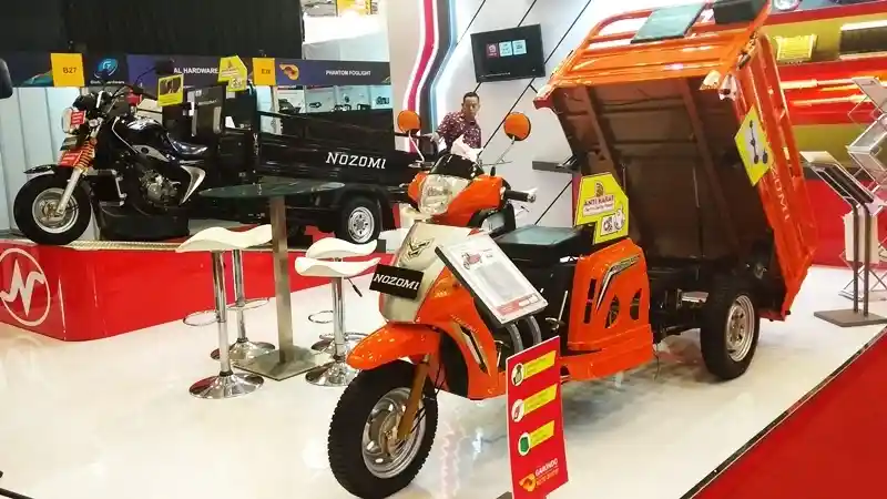 Sepeda motor roda tiga yang dibuat untuk kendaraan niaga bermerek Nozomi hadir di Gaikindo Indonesia International Auto Show 2018 yang diadakan di ICE, BSD, Tangerang (2-12/8).