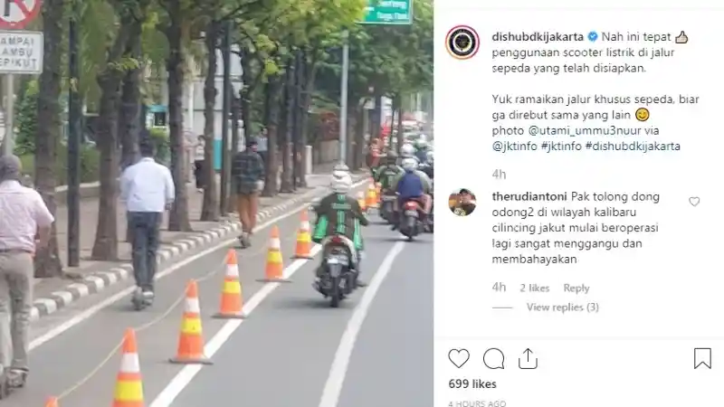 "Yang pingin ngiter-ngiter DKI Jakarta naik Scooter Listrik, gunakan aja jalur sepeda yang sudah ada, jangan di trotoar apalagi nyebrang JPO. Dengan kecepatan yang lumayan tinggi, dapat membahayakan diri sendiri dan orang lain lho," tulis akun Instagram resmi Dishub (@dishubdkijakarta) dalam sebuah unggahan himbauan masyarakat.