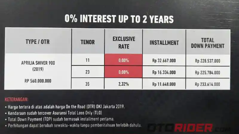 "Ada diskon khusus. Buat installment credit itu ada 0 persen selama dua tahun. Itu paling kisaran bayarnya seperti bayar cash, cuma plus asuransi saja," kata Kevin Lahandang, Sales Aprilia pada OtoRider di Jakarta (9/10).