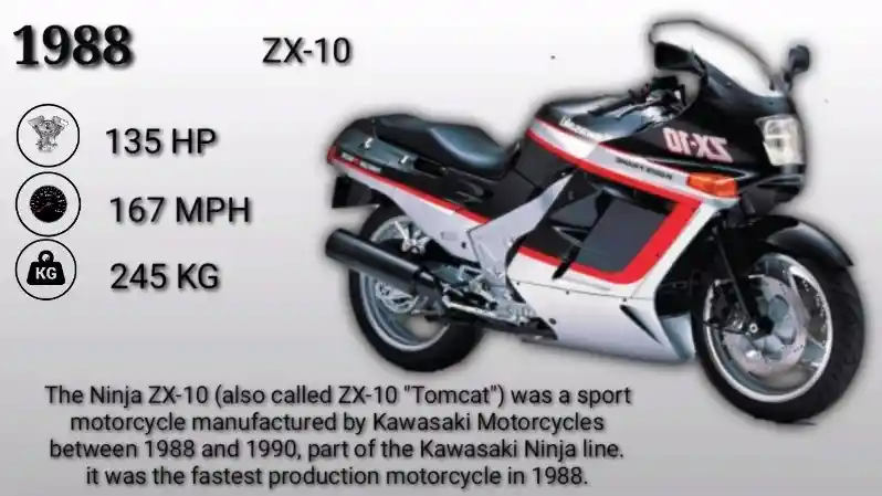 Kemudian pada tahun 1988, Kawasaki meluncurkan Ninja dengan nama ZX-10 untuk pertama kalinya. Pada saat itu, motor ini masuk ke dalam motor dengan produksi masal tercepat di dunia. Hingga saat ini, nama ZX-10 masih terus digunakan sebagai nama besar Ninja berkapasitas 1.000 cc.