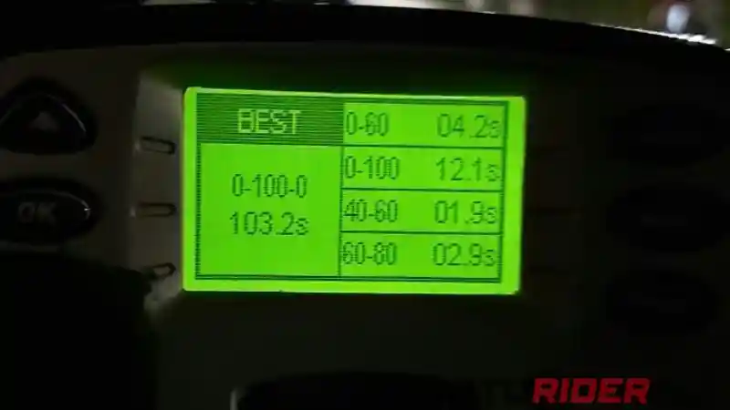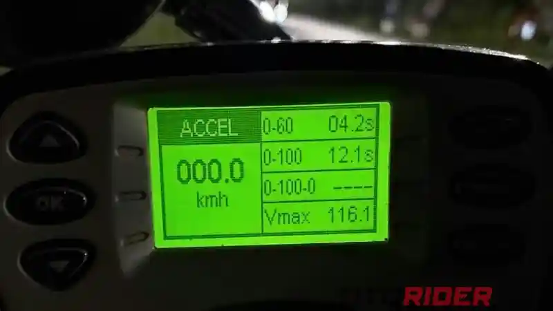 Sayangnya, lintasan pengetesan yang tak terlalu panjang membuat skuter ini belum menunjukkan kecepatan maksimumnya. Saat diuji, kecepatan tertinggi di speedometer yang diperoleh OtoRider hanya menyentuh 125 km/jam. Sementara itu, pada perangkat Race Logic Performance Box tercatat 116,1 km/jam.