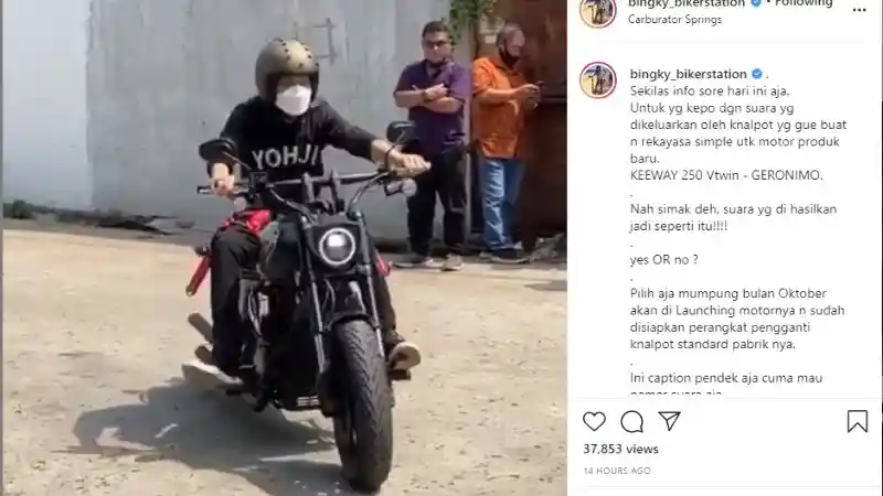 "Sekilas info sore hari ini aja. Untuk yang kepo dengan suara yang dikeluarkan oleh knalpot yang gue buat n rekayasa simple untuk motor produk baru. Keeway 250 Vtwin - GERONIMO," ungkap Bingky pada caption Instagram unggahannya.