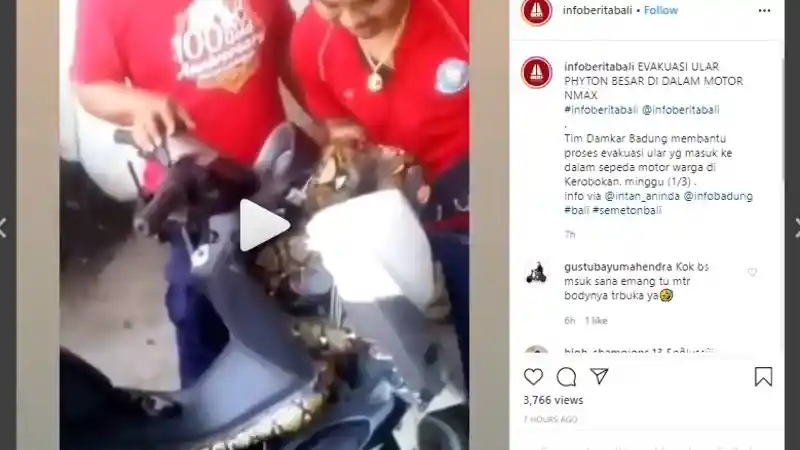 "Evakuasi ular python besar di dalam motor NMax. Tim Damkar Badung membantu proses evakuasi ular yang masuk ke dalam sepeda motor warga di Kerobokan, Minggu (1/3)," tulis akun @infoberitabali di unggahan instagramnya.