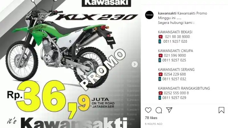 Jaringan purna jual Kawasaki yang memberikan diskon pada KLX 230 adalah dealer Kawansakti. Informasi ini diketahui pertama kali melalui sosial media Instagram @kawansakti. Lewat unggahan gambar, dealer tersebut membanderol motor trail 230 cc itu dengan harga Rp 36,9 juta dari harga semula Rp 43,3 juta.