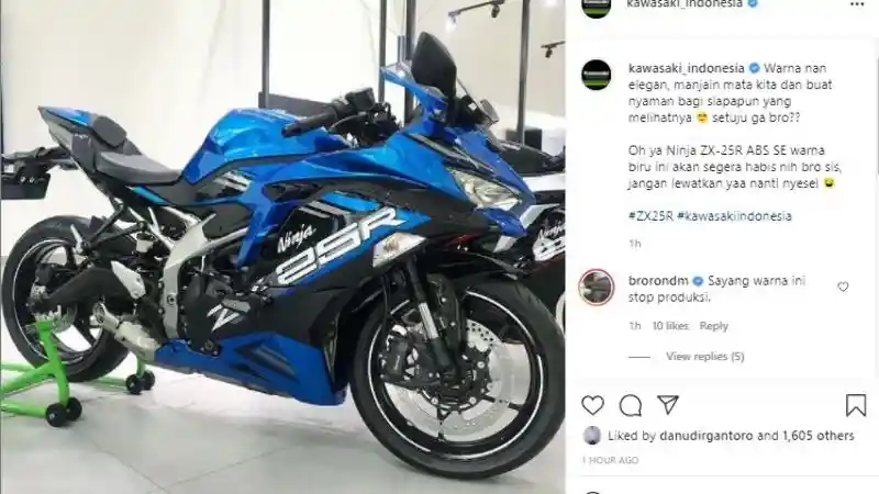 "Ninja ZX-25R ABS SE warna biru ini akan segera habis nih bro sis, jangan lewatkan yaa nanti nyesel," bunyi kolom keterangan di akun Instagram @kawasaki_indonesia, diunggah Senin (28/6).