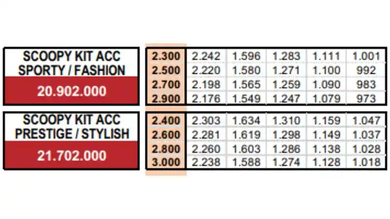 Cicilan per bulan terendahnya sebesar Rp 973 ribuan untuk tipe Scoopy Sporty/ Fashion dengan tenor 35 bulan. Sedangkan, cicilan tertinggi sekitar Rp 2,3 jutaan untuk tipe Scoopy Prestige/ Stylish selama 11 bulan.