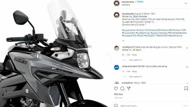 Gambar render Suzuki V-Strom 150 merupakan buatan artisan David Aradea yang mencoba membayangkan konsep motor di segmen yang sama seperti CB150X. Suzuki V-Strom sendiri memiliki beberapa kelas di pasar global, sayangnya tidak dijual di Indonesia. V-Strom dijual di luar negeri mulai dari kapasitas 250 cc, hingga 1.000 cc.