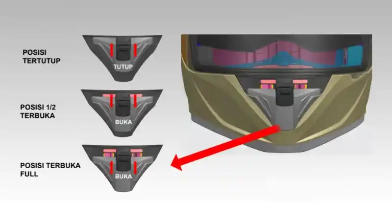 Johanes menambahkan, top vent berfungsi memaksimalkan udara yang masuk ke dalam helm menuju dahi atau wajah bagian atas. Sementara itu, top side vent memaksimalkan perputaran sirkulasi udara yang masuk ke dalam helm.