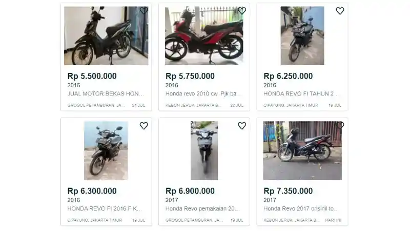 Berdasarkan pantauan OtoRider di situs jual beli motor bekas online, harga Honda Revo memiliki sejumlah perbedaan. Harga ini ditentukan oleh tahun serta kondisi aktual motor tersebut. Kali ini, unit yang dipilih adalah keluaran tahun 2016 hingga 2020 dan merupakan area sekitaran Jakarta.
