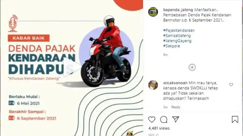 Adanya kebiakan Pemberlakuan Pembatasan Kegiatan Masyarakat (PPKM) membuat sejumlah daerah menghadirkan pemutihan pajak. Tentunya kesempatan ini sangat bagus bagi para pengguna motor atau kendaraan lainnya. Setidaknya terdapat enam daerah yang diketahui melakukan pemutihan pajak melalui masing-masing Instagram Badan Pajak Daerah (Bapenda).