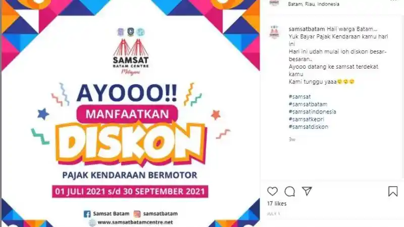 Tidak ketinggalan Instagram Samsatbatam juga menghdairkan beberapa program pajak untuk Pemprov Kepulauan Riau. Mulai dari bebas denda pajak, diskon pajak kendaraan 50% bagi yang menunggak lebih dari 1 tahun, keringanan pajak, gratis BBNKB kedua, hingga keringanan denda SWDKLLJ. Program ini dapat dimanfaatkan hingga tanggal 30 September 2021 mendatang.