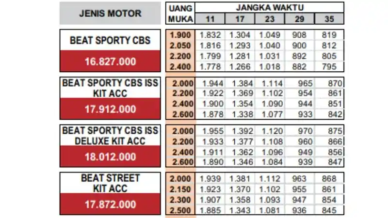 Cicilan per bulan terendahnya sendiri sebesar Rp 795 ribuan untuk tipe BeAT CBS dengan tenor 35 bulan. Sedangkan, cicilan tertinggi sekitar Rp 1,9 jutaan untuk tipe BeAT CBS-ISS Deluxe dengan aksesoris selama 11 bulan.