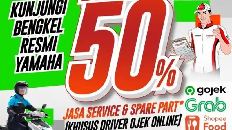 Melalui program ini, Yamaha bakal memberikan potongan harga sebesar 50% dengan maksimal diskon Rp 35 ribu untuk para pengemudi Gojek, Grab, dan Shopee Food yang melakukan servis motor Yamaha sepanjang September. Pengemudi bebas memilih diskon tersebut digunakan untuk potongan harga jasa servis atau pembelian spare part.
