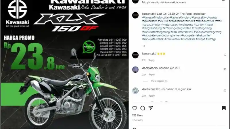 Promo harga Kawasaki KLX 150BF oleh Kawansakti ini pertama kali diketahui lewat sosial media Instagram di @kawansakti. Dalam unggahan foto tertulis harga promo Kawasaki KLX 150BF. Dengan harga promo ini, konsumen hanya cukup membayar Rp 23,8 juta saja untuk membawa pulang motor trail tersebut.