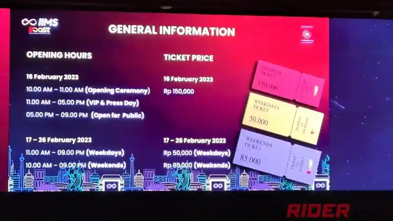 Harga tiket untuk IIMS 2023 weekdays (Senin-Jumat) Rp 50 ribu. Sedangkan, weekend (Sabtu-Minggu) Rp 85 ribu. Selain itu, pengunjung juga bisa membeli tiket khusus di hari pertama pameran. Harganya Rp 150 ribu per orang. Tiket ini lebih mahal karena pengunjung bisa melihat seisi pameran lebih awal dan sepi.