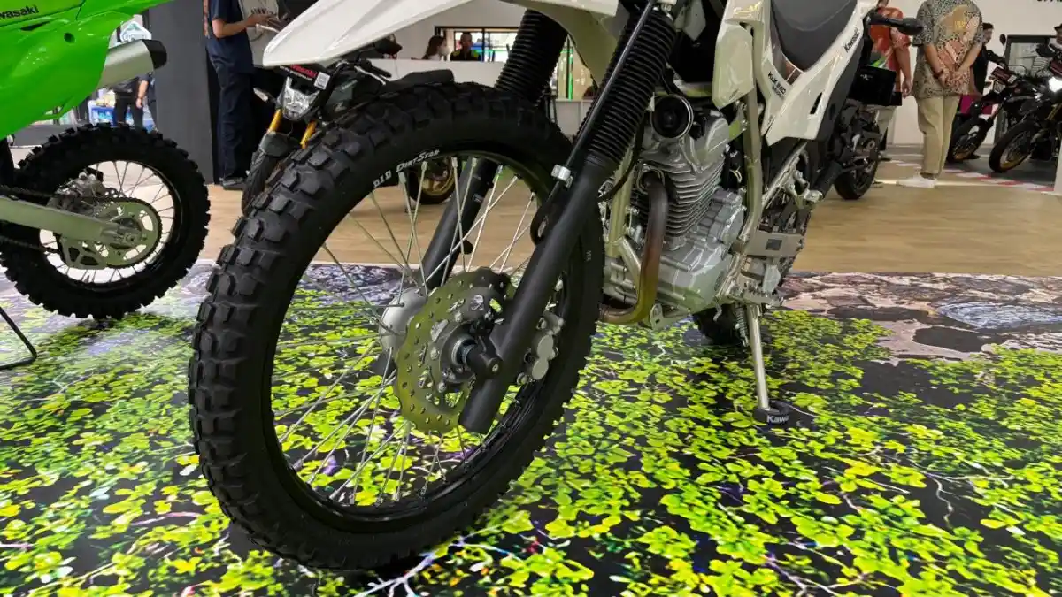 Kawasaki KLX230 Sherpa juga dibekali pelek jari-jari berdiameter 21 inci di depan dan 18 inci di belakang. Uniknya, pelek belakang DID milik Sherpa mengakomodir ban model tubeless.