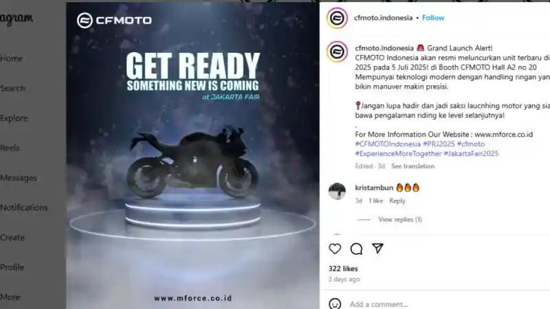 CFMoto, yang satu grup bisnis dengan MForce di Indonesia, mem-posting tampilan siluet sebuah motor berfairing dengan caption Grand Launch Alert!